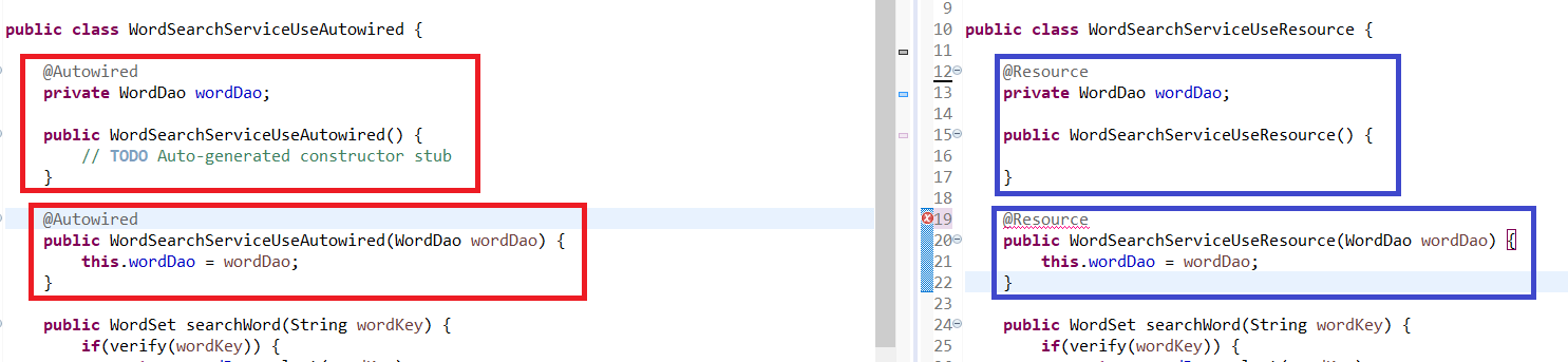 @Autowired 사용과 @Resource 사용 비교 ※ 생성자가 아닌 Property나 Method에 @Autowired 혹은 @Resource를 쓰려면 Default 생성자를 반드시 명시해줘야 합니다. 그리고 @Resource는 생성자에는 사용할 수 없고 Property와 Method에만 사용 가능합니다.