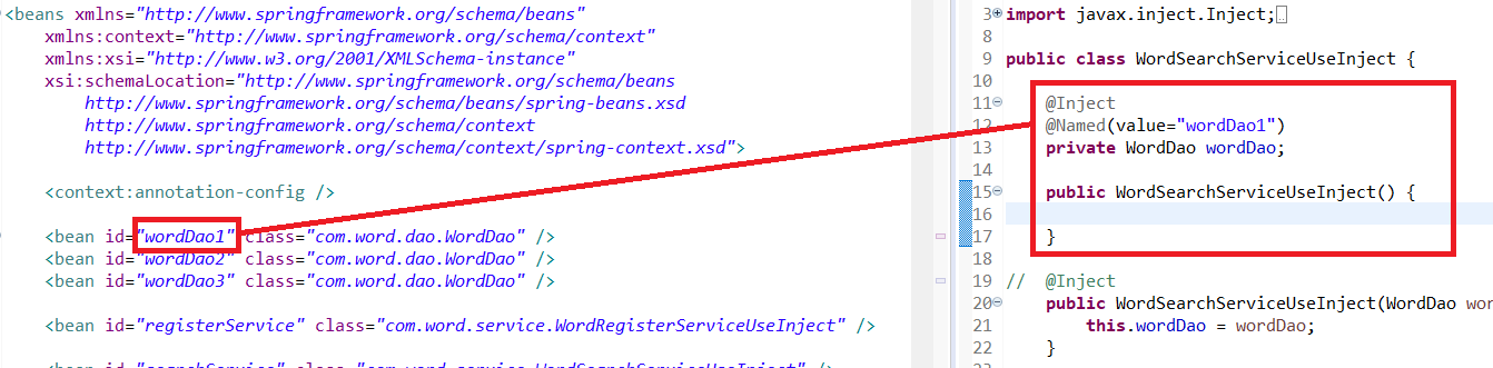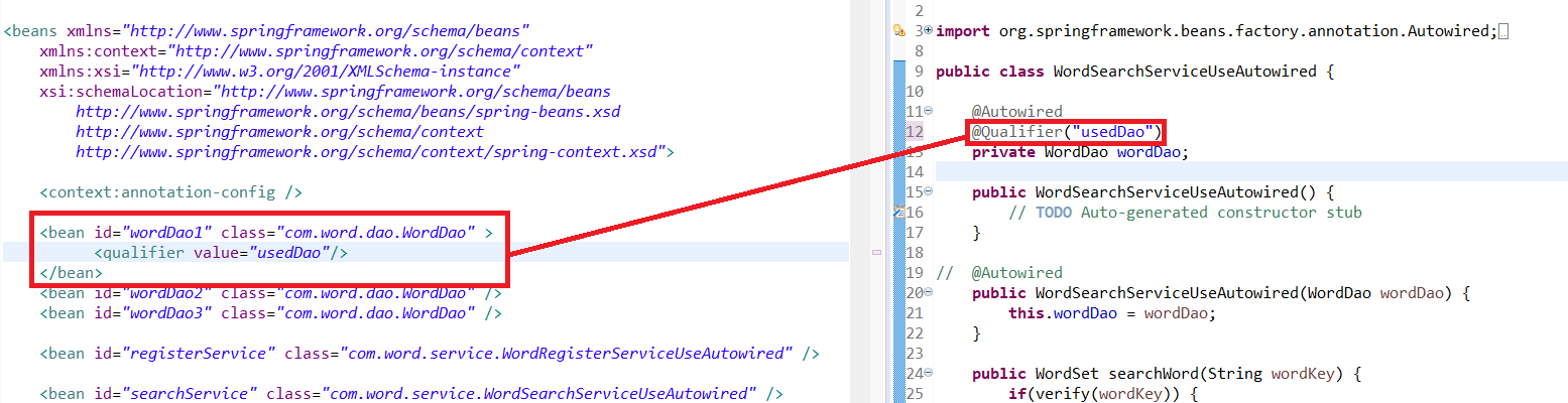 'wordDao1'을 qualifier를 통해 우선 객체로 설정 또 다른 방법으로는 @Inject 어노테이션을 사용할 경우 @Named 어노테이션을 추가하는 것 입니다.
