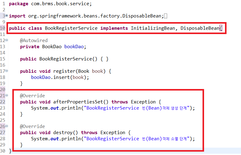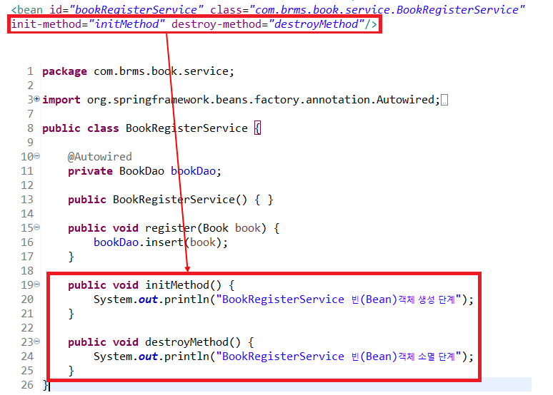 빈 객체가 생성이되고 소멸되는 시점에 특정한 작업을 할 수 있는데 그 특정한 작업을 할 수 있는 방법은 인터페이스(Interface)를 이용하는 방법과 init-method와 destroy-method 속성을 이용하는 방법이 있습니다.