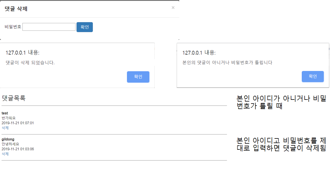 삭제가 완료되면 댓글이 삭제되었다는 alert창이 뜨고 만약 본인의 댓글이 아니거나 패스워드가 틀리면 다른 alert창이 뜨게끔 구현했습니다.