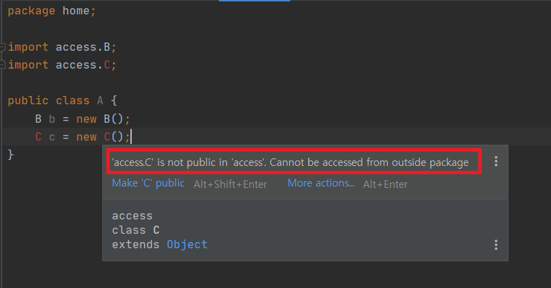 default 클래스는 다른 패키지의 접근을 불허 클래스 A에서 default로 접근 지정된 C 클래스에 접근할 수 없는 것을 확인