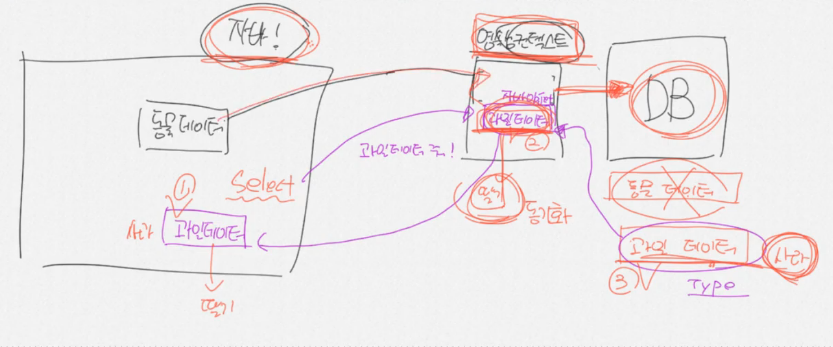영속성 컨텍스트의 과일 데이터가 딸기로 바뀌고, DB에게 딸기를 저장하면 insert 쿼리가 아닌 update 쿼리가 작동하면서 DB의 과일 데이터가 딸기로 변경된다.