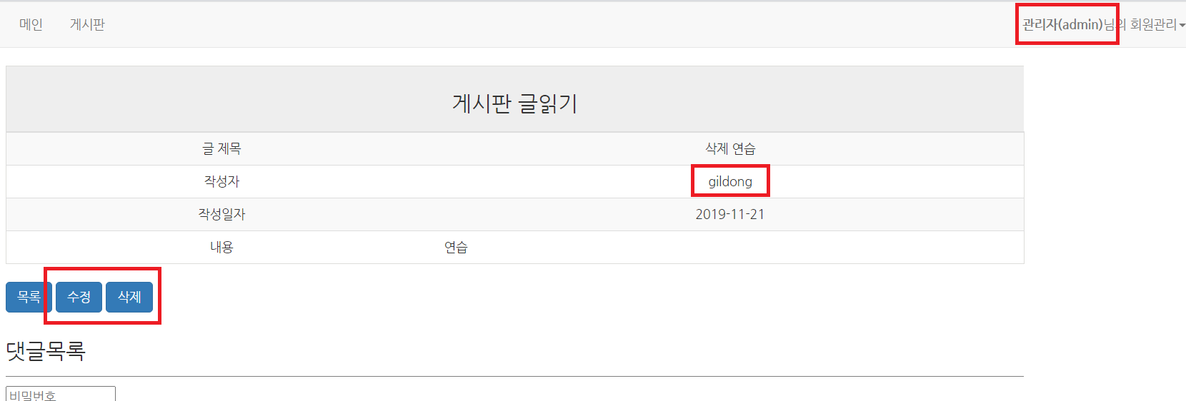 관리자 계정으로 게시글 관리가 가능하다. 댓글 관리