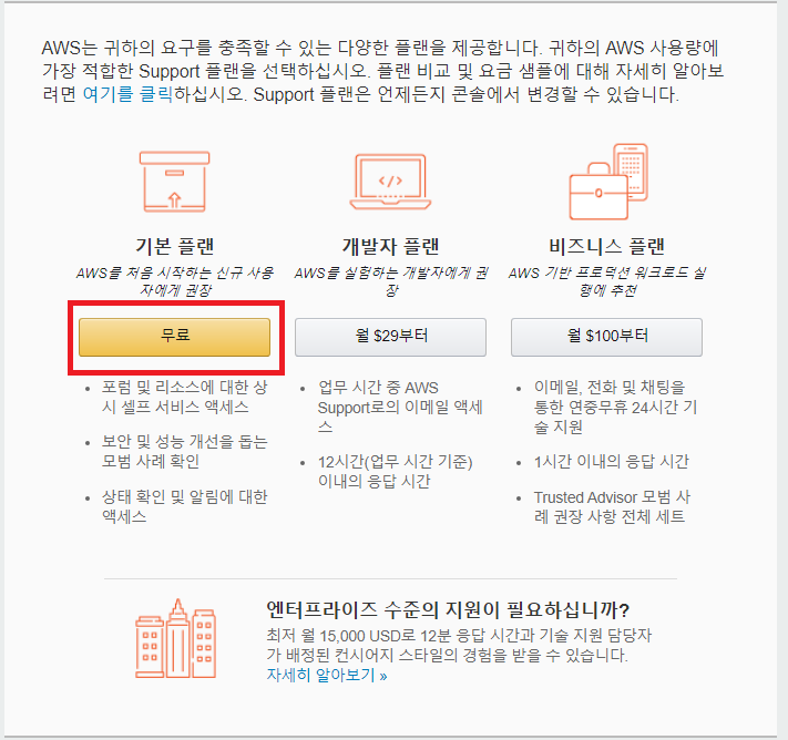 마지막으로 지원 플랜을 선택합니다. 무료로 사용하기 위해서는 맨 왼쪽의 기본 플랜을 선택하셔야 합니다. 선택을 완료하면 AWS 프리티어 회원가입이 완료됩니다.
