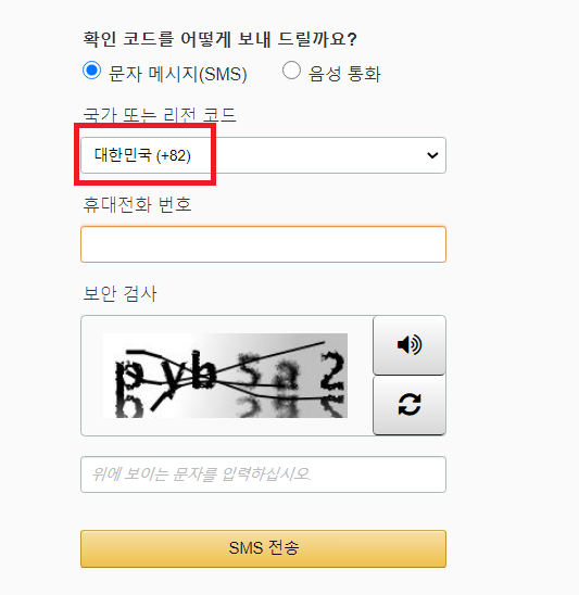 문자 메세지 또는 음성 통화를 위해 본인 인증을 할 수 있는데, 저는 문자 메세지를 이용하도록 하겠습니다. 국가 또는 리전 코드가 대한민국(+82)로 선택이 잘 되었는지 확인하고 휴대폰 번호를 입력하신 후 보안검사에 적힌 문자를 입력하고 SMS 전송 버튼을 누릅니다.