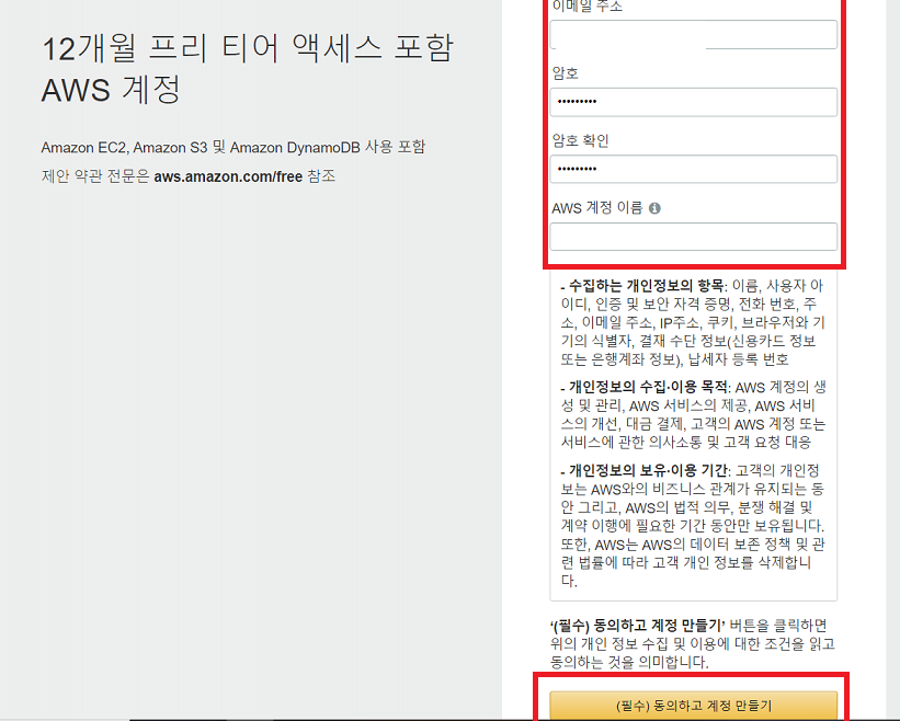 계정 유형을 개인으로 선택한 후, 개인 정보를 입력합니다. (모두 필수 사항이므로 반드시 입력해야 합니다.) 이때 국가/리전을 대한민국으로 선택하시고, 주소와 우편번호 관련 정보는 네이버에 영문주소를 검색하셔서 알아낸 정보를 입력하시면 됩니다. 모두 완료가 되면 동의 버튼을 누르고 다음으로 진행합니다.