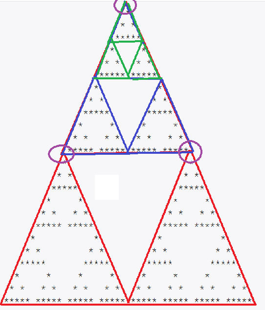 따라서 삼각형을 그릴 시작 좌표와 n의 크기를 매개변수로 재귀함수를 시작해서 n == 3일 때까지 계속 쪼개가면서 삼각형을 그리도록 구현하였습니다.