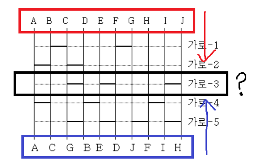 https://www.acmicpc.net/problem/2469 시작 알파벳에서 '?' 전까지, 결과 알파벳에서 '?' 전까지 알파벳의 순서를 계속 수정합니다. 위의 예시에선 최종적으로 '?' 전의 시작 알파벳과 '?' 전의 결과 알파벳은 다음과 같이 만들어집니다.