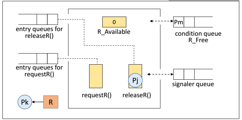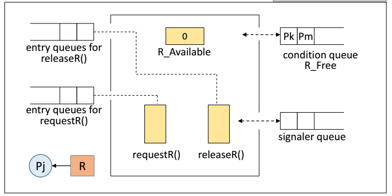자원 할당 시나리오 4 j가 자신의 일을 끝내고 R을 반납하고 available 값을 1로 바꿈, 신호 제공자 큐로 가서 자원 할당을 기다리는 k 프로세스를 wakeup 하고, k가 자원 R을 할당 받게 되면서 available 값이 다시 0이 됨