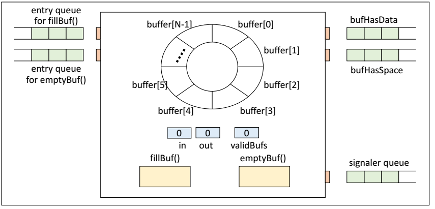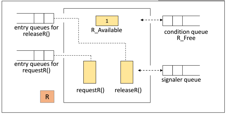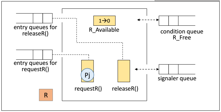- Signaler Queue(신호 제공자 큐) : 모니터에 항상 하나의 신호 제공자 큐가 존재, signal() 명령을 실행한 프로세스가 임시 대기