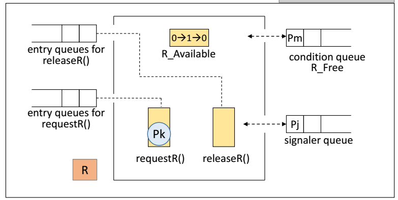 자원 할당 시나리오 1 자원 R이 사용 가능하고, Monitor 안에 어떠한 프로세스도 존재하지 않는 상태