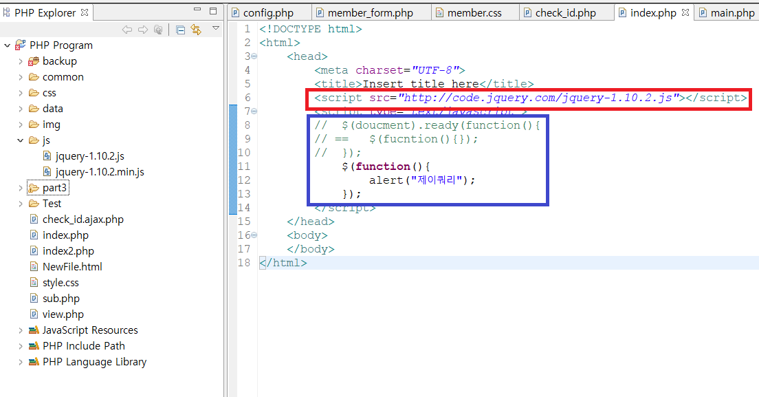 위에서 파란색으로 체크한 부분은 jQuery로 어떠한 이벤트를 넣어야 할 때 반드시 써야하는 시작 코드이다.