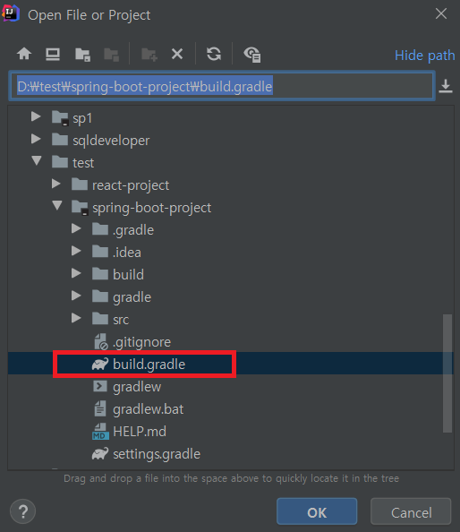 Open File or Project Open File or Project를 누르고, 아까 프로젝트 압축을 풀었던 폴더를 찾아서 열어주는데, 이때 build.gradle 파일을 더블클릭하여 열어줍니다. (프로젝트를 엶과 동시에 의존성들을 로컬에 다운받기 위해서입니다.) 의존성을 다운로드 받는데 꽤 시간이 걸리므로 다될 때 까지 기다려주기만 하면 프로젝트 환경 구축 완료입니다.
