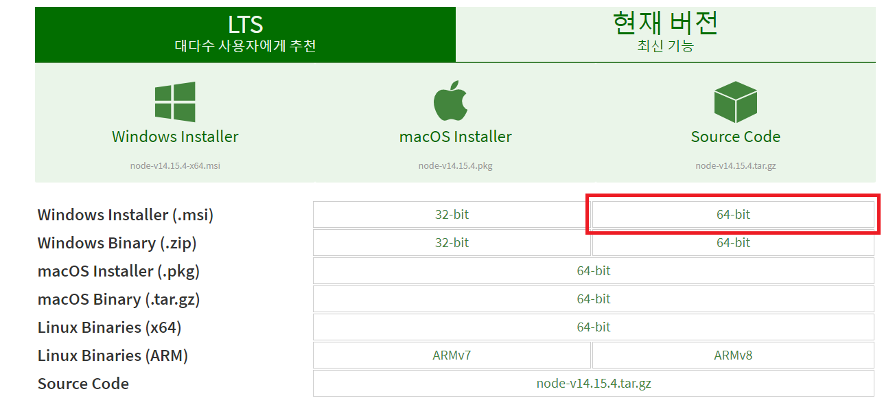 node.js 설치법은 간단합니다. node.js 공식 홈페이지에 들어가서 본인의 OS 및 환경에 맞는 인스톨러나 소스코드를 다운받아 바로 설치하시면 됩니다. 저는 윈도우에 64bit 환경이므로 아래 파일을 다운로드 받았습니다.