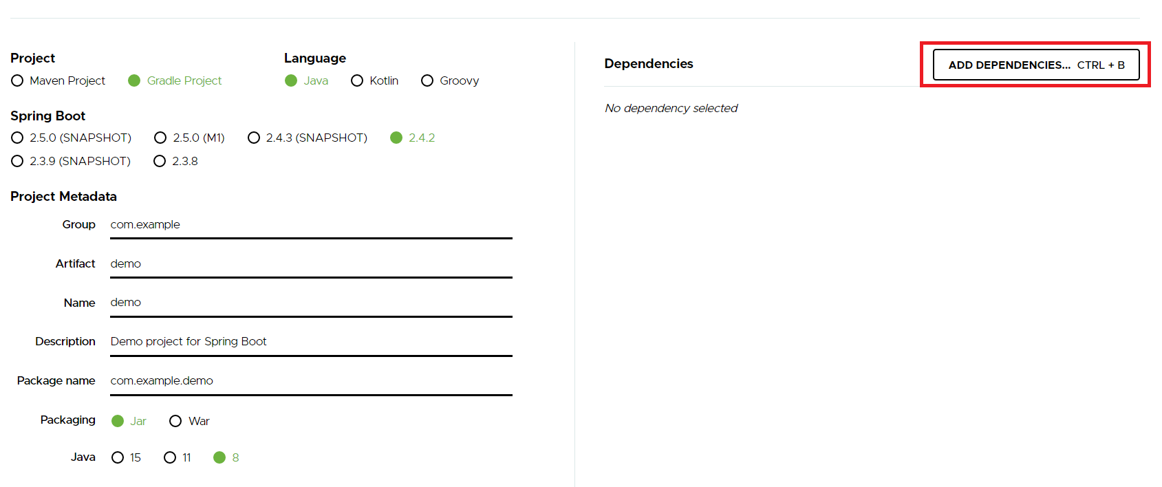 Spring Initializer 페이지 들어가보면 위와 같이 빌드 툴을 Maven을 쓸건지, Gradle을 쓸껀지 고를 수 있고, 스프링의 버전 선택 등 다양한 옵션을 선택할 수 있습니다. 이번 프로젝트에서는 Gradle 프로젝트를 생성하고, Java 8버전을 사용하도록 하겠습니다. 나머지 스프링 부트 버전과 패키징 옵션은 아무거나 선택하셔도 괜찮습니다.