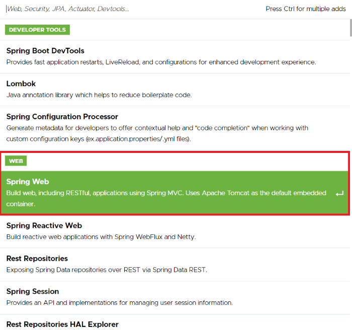 ADD DEPENDENCIES 페이지 스프링 부트를 통해 웹 어플리케이션을 개발할 때, 이를 쉽게 도와주는 의존성들을 모두 모아둔 곳입니다. 다양한 의존성들이 있지만 이번 실습에서는 REST API 서버 개발만 필요하므로, Spring Web 이라는 의존성을 추가하도록 하겠습니다.