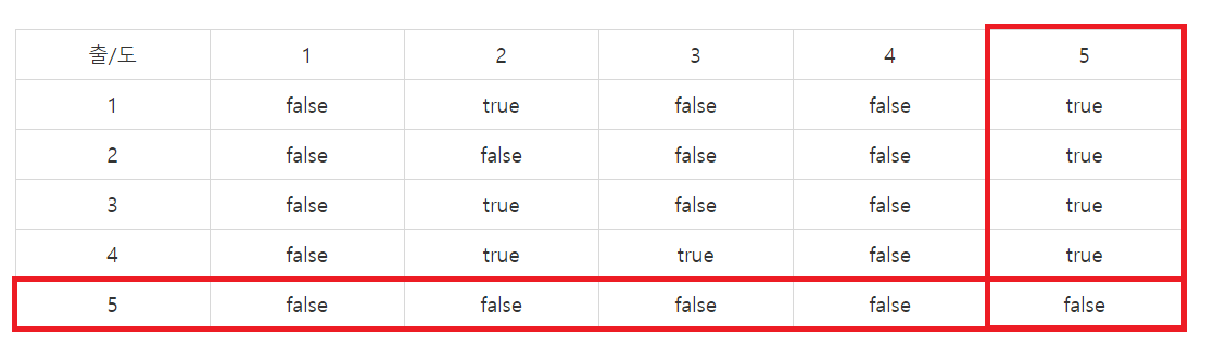 출/도 1 2 3 4 5 1 false true false false true 2 false false false false true 3 false true false false true 4 false true true false true 5 false false false false false 또한 예시를 살펴보면, 2번 선수는 [1, 3, 4] 선수에게 패배했고 5번 선수에게 승리했기 때문에 4위입니다. 그리고 5번 선수는 4위인 2번 선수에게 패배했기 때문에 5위입니다. 이를 통해 순위를 결정짓는 조건이 경기 결과가 중복없이 n-1회 발생해야 한다는 것을 확인할 수 있습니다.