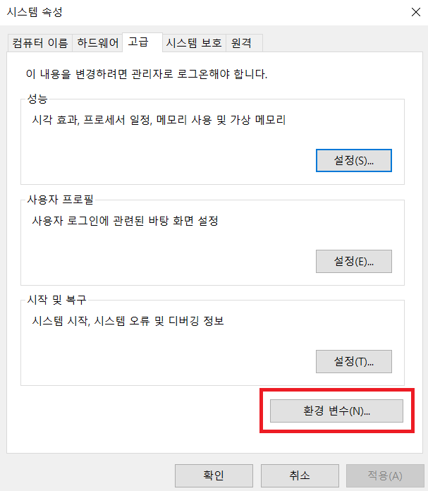 고급 시스템 설정의 환경변수