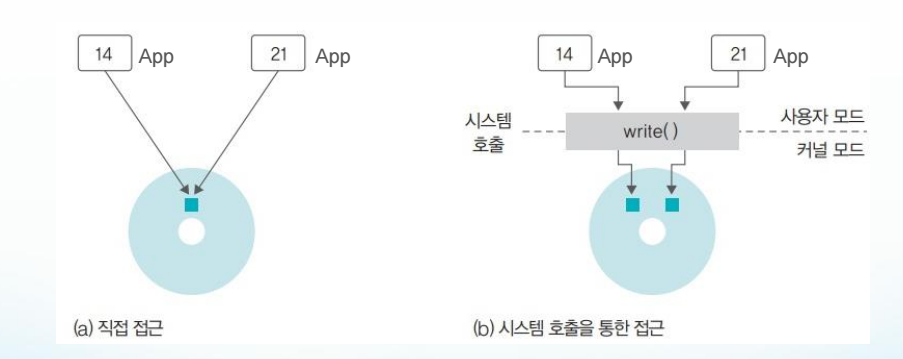 그러나 '시스템 호출을 통한 접근'은 직접 하드디스크에 데이터를 저장하지 않고 커널이 제공하는 write() 함수를 사용하여 데이터 저장을 요청한다. 응용 프로그램은 데이터가 어느 위치에 어떤 방식으로 저장되는지 알 수 없고 이를 확인하기 위해서 read() 함수로 시스템 호출을 이용하여 가져와야 한다. 따라서 컴퓨터 자원을 관리하기가 수월하다.