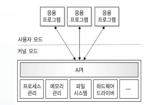 커널의 핵심 기능을 구현하는 모듈들이 구분 없이 하나로 구성되어 있는 구조