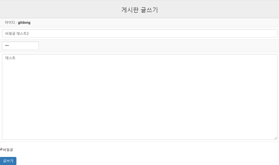 이렇게 글쓰기 화면과 비밀 글을 포함한 글쓰기 기능 구현을 완료하였습니다. 여태까지 진행했던 과정중에 가장 길고 어렵게 느껴질 실습이었다고 생각합니다. 천천히 잘 따라해보시고 결과물을 확인해보시길 바랍니다! 다음 실습에서는 이렇게 작성한 게시글을 읽을 수 있게 만들어보는 시간을 가지도록 하겠습니다.