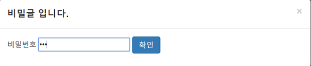 <!-- 비밀 글 모달창 양식 구현--> <div class="modal fade" id="modal_div"> <div class="modal-dialog"> <div class="modal-content"> <!-- header --> <div class="modal-header"> <!-- 닫기(x) 버튼 --> <button type="button" class="close" data-dismiss="modal">×</button> <!-- header title --> <h4 class="modal-title"><b>비밀글 입니다.</b></h4> </div> <!-- body --> <div class="modal-body"> <form method="post" id="modal_form" action="./ck_read.php?idx=" data-action="./ck_read.php?idx="> <p>비밀번호 <input type="password" name="pw_chk" /> <input type="submit" class="btn btn-primary" value="확인" /></p> </form> </div> </div> </div> </div> <!-- 비밀 글 모달창 구현 끝-->위의 코드는 부트스트랩을 이용하여 만든 모달 창 코드입니다. 모달창의 body 부분에 form을 구현하여 입력받은 비밀번호를 비밀번호 비교를 위한 코드인 ck_read.php로 전송하게끔 구현하였습니다. data-action이 의미하는 바는 예전 실습에서 설명하였으므로 참고하시길 바랍니다. 여기서도 가장 상위 div 태그의 id인 'modal_div'와 form 태그의 id 'modal_form'을 기억해두시길 바랍니다. (+ input 태그의 'pw_chk' 도 기억해둡시다! 다음 실습에서 한번 더 언급하겠습니다.)