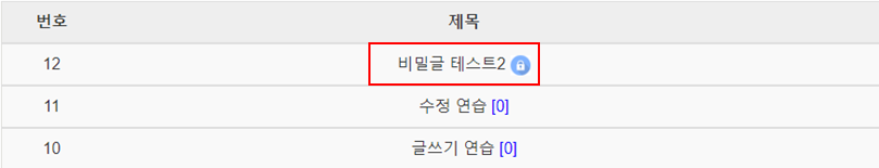 체크됐을때 결과 비밀 글은 위과 같이 제목 옆에 자물쇠 모양을 두어 공개 글과 구분할 수 있도록 만들어줍니다. 이를 위해서 list.php 일부분을 수정해주어야 하는데 코드는 다음과 같습니다.