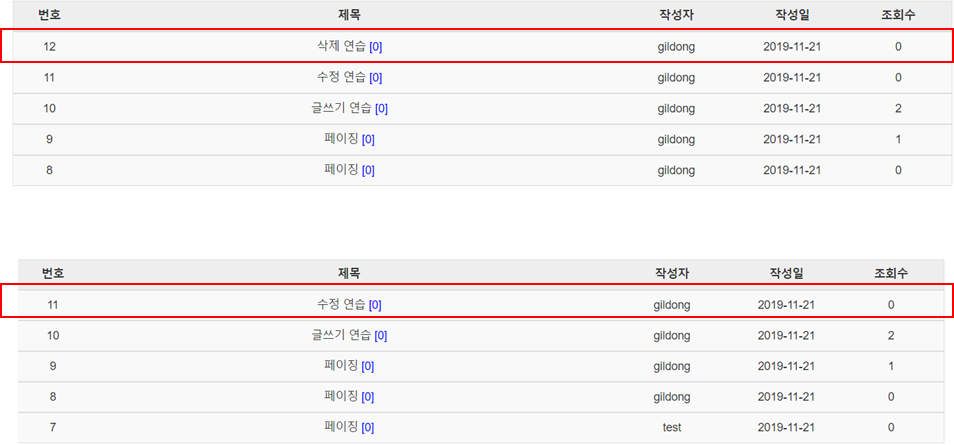12번 게시글이 삭제된 것을 확인 가능 수정/삭제 실습은 이전의 실습을 통해 DB Transaction에 익숙해졌기 때문에 중복되는 내용이 많아 설명을 많이 생략하였습니다. 코드를 보면서 직접 실습 하시다보면 어렵지 않게 이해하실 거라고 생각합니다.